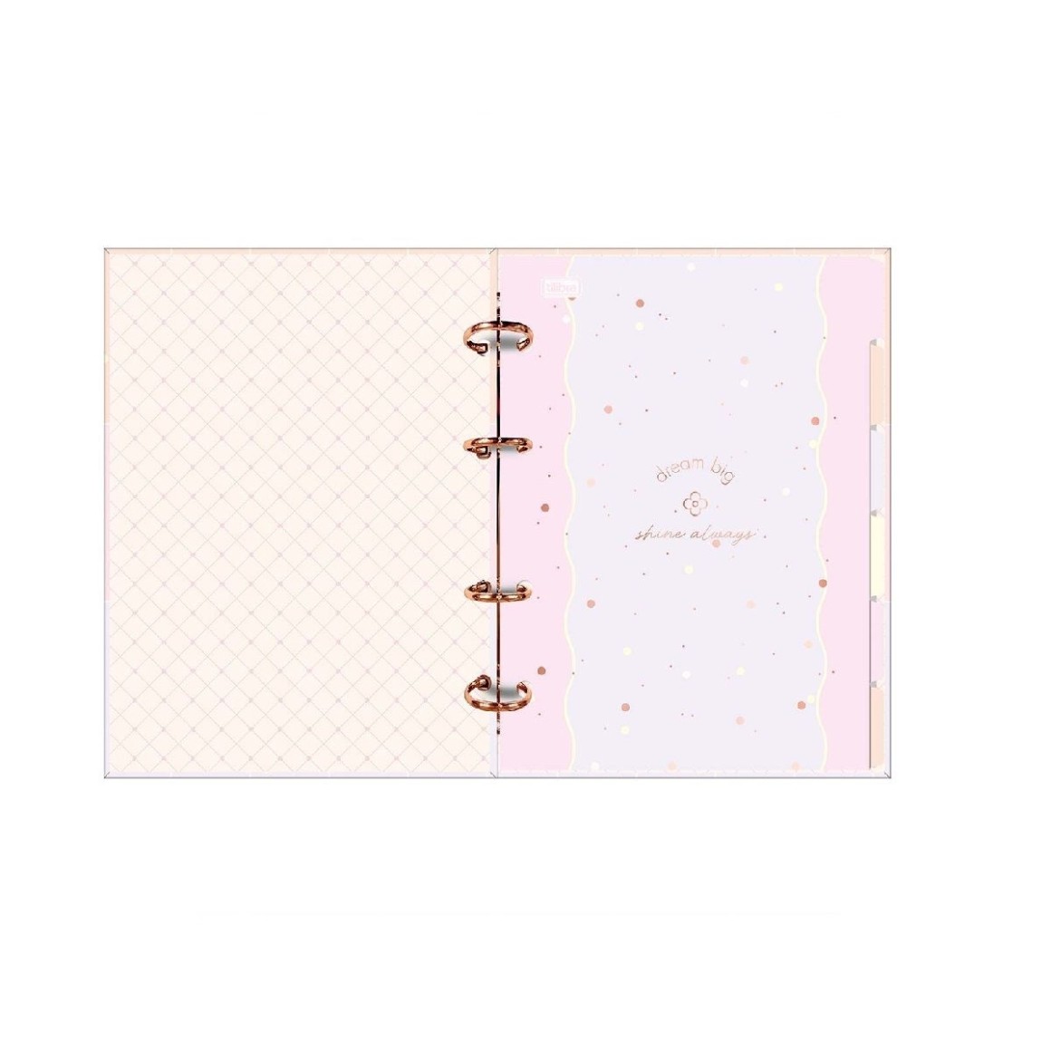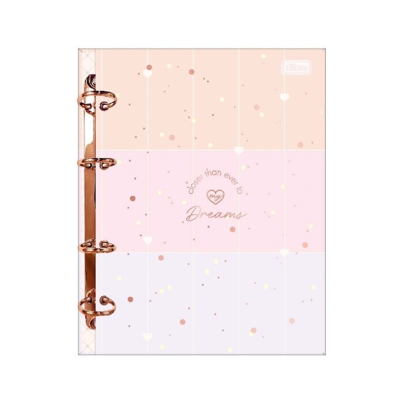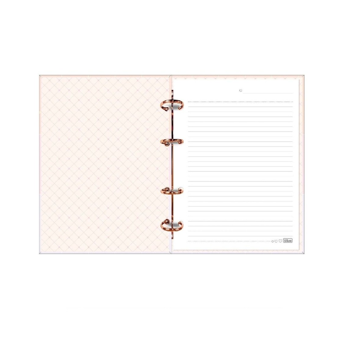 O caderno argolado Tilibra possui capa dura com detalhe metalizado e parte interna decorada, oferecendo um visual sofisticado. O produto também vem com adesivos, bolsa plástica para guardar trabalhos e anotações, jogo com seis divisórias e refil de 80 folhas pautadas e decoradas. Adquira agora o seu!