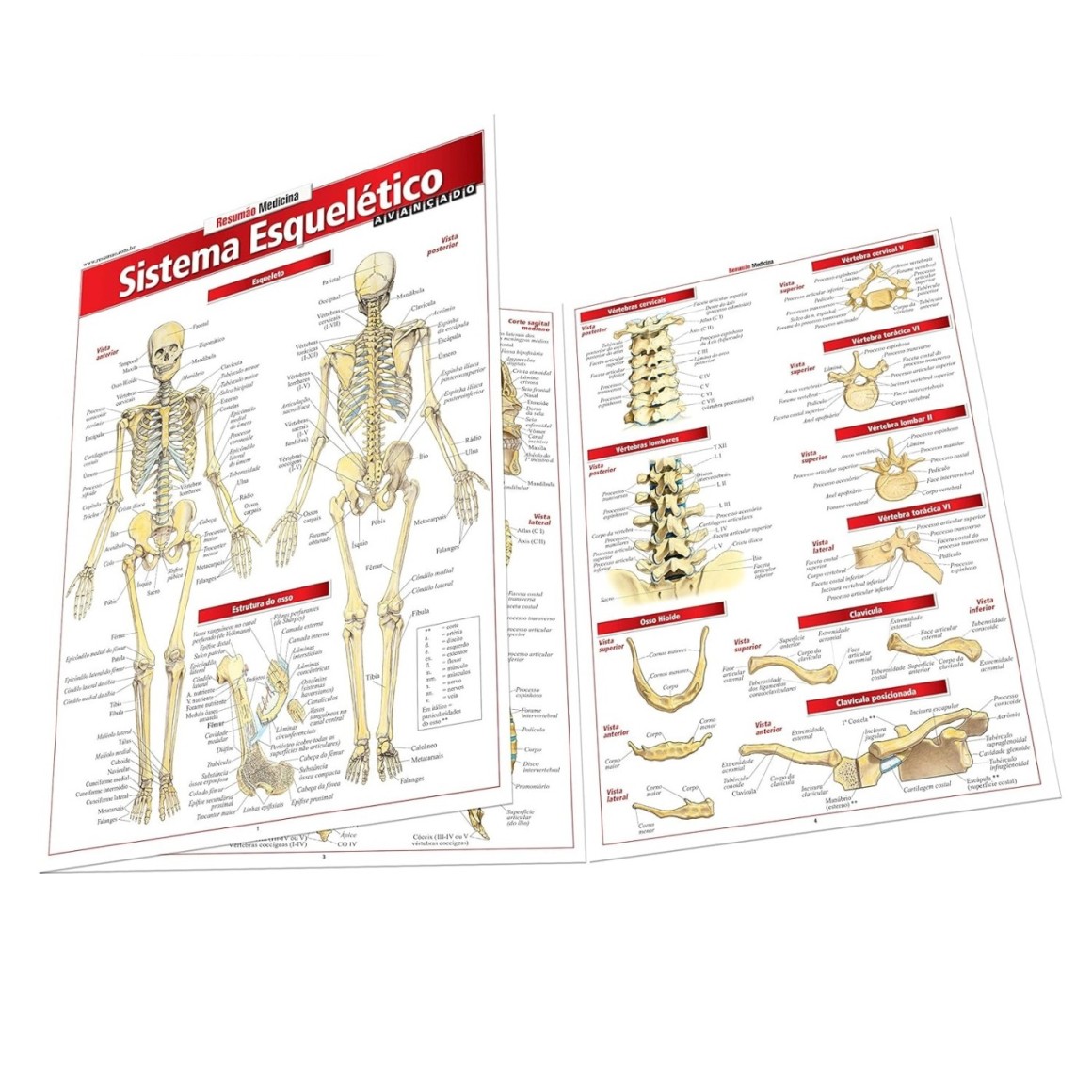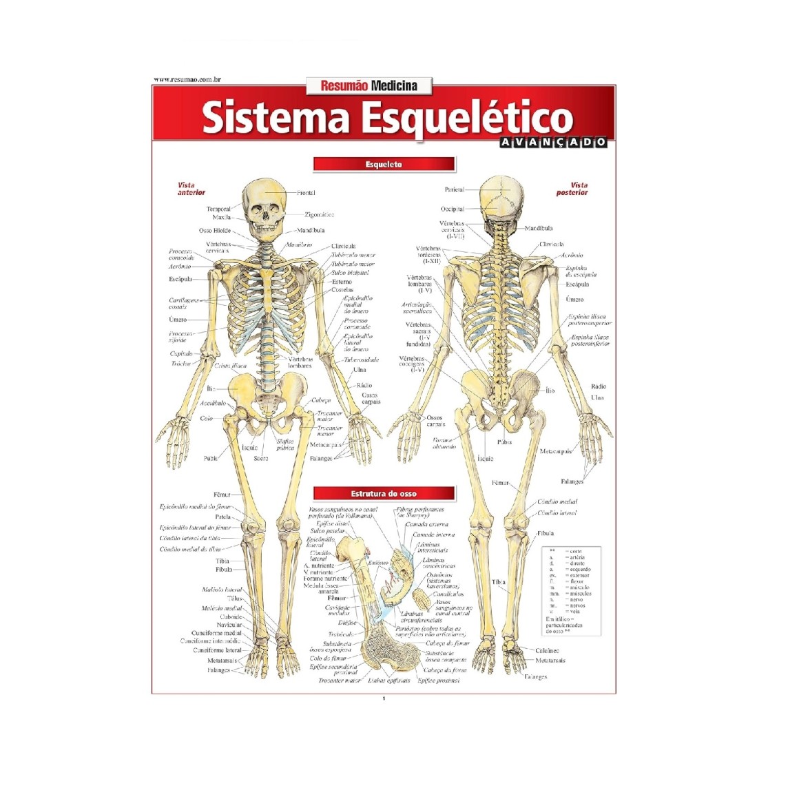 Resumo completo de Anatomia com mais de 1.400 identificações anatômicas. Os ossos do esqueleto. A coluna vertebral, a estrutura de vértebras e nervos. Os ossos da cabeça. O sistema linfático. O sistema nervoso. O sistema respiratório. O sistema endócrino. O sistema digestório. O sistema urinário. Os sistemas de reprodução masculino e feminino. O sistema circulatório e o coração. O sistema muscular. O cérebro. O quadril. O nervo ciático. Os ligamentos do joelho. A cabeça. A pele. Anatomia da mão, dos dedos e do pé.