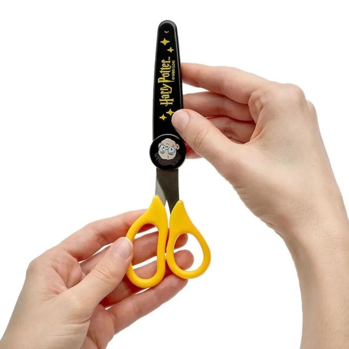 A tesoura vem com estampa na lâmina de aço inoxidável, e capa protetora estampada com ilustração do Harry Potter para maior segurança na hora de guardar e armazenar no estojo.