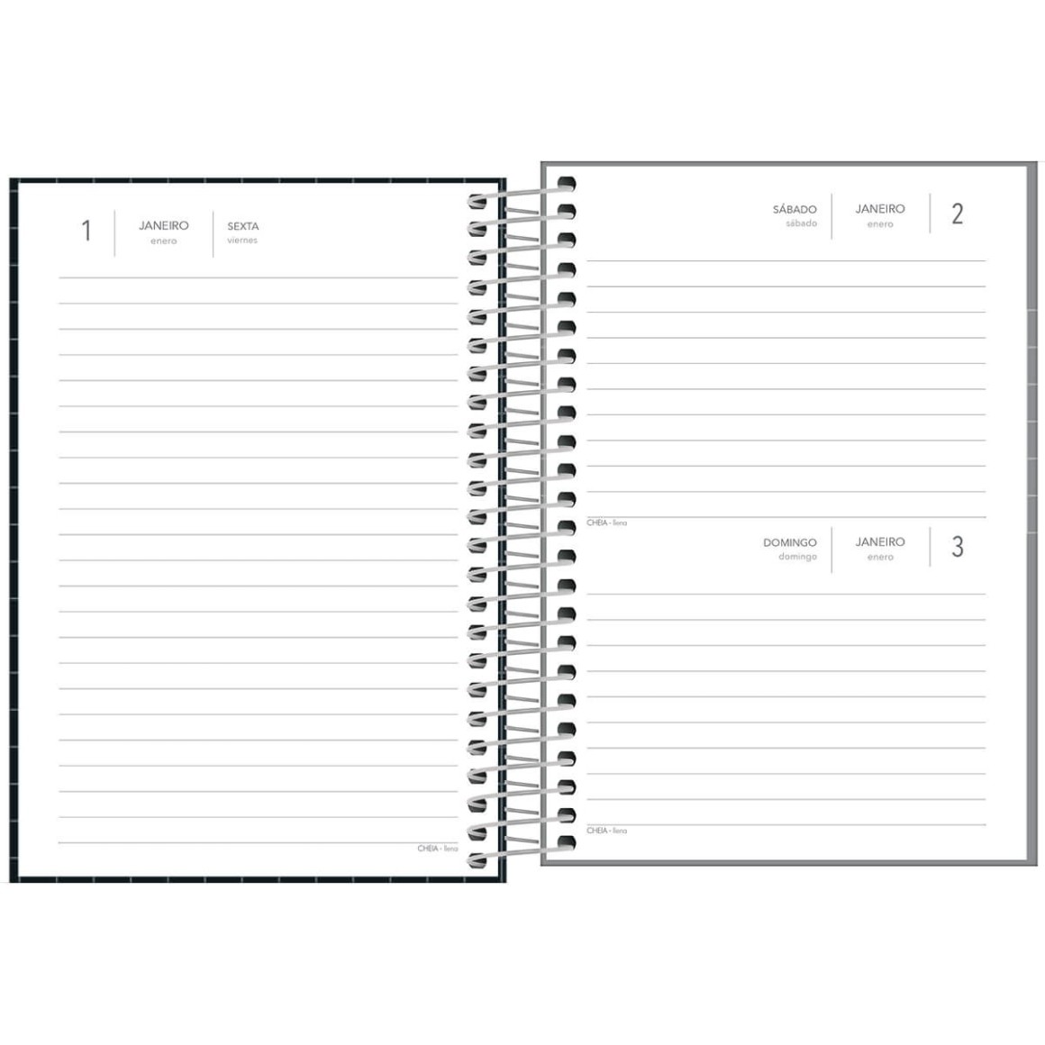 Agenda espiralada com visão de 1 dia por página, exceto sábado e domingo. Possui capa dura, parte interna da capa decorada e bolsa plástica para guardar trabalhos e anotações. Ideal para a organização do dia a dia.