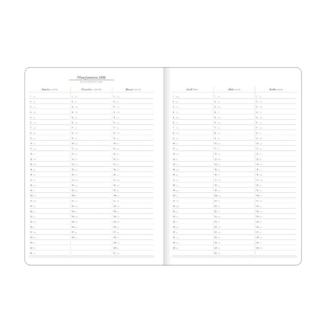 O produto tem capa flexível, visões anual e mensal e miolo com 20 folhas, com gramatura 90 g/m².