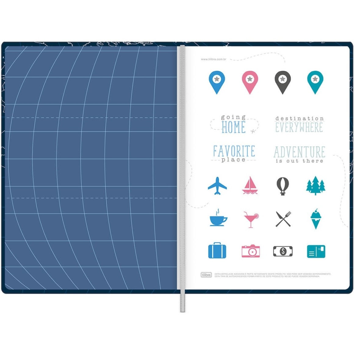 O Diário de Viagem possui capa dura com material especial e parte interna decorada. Possui fitilho e elástico para fechamento. As folhas internas possuem conteúdo e espaço para anotações, e é ideal para registro das aventuras vividas em viagens.