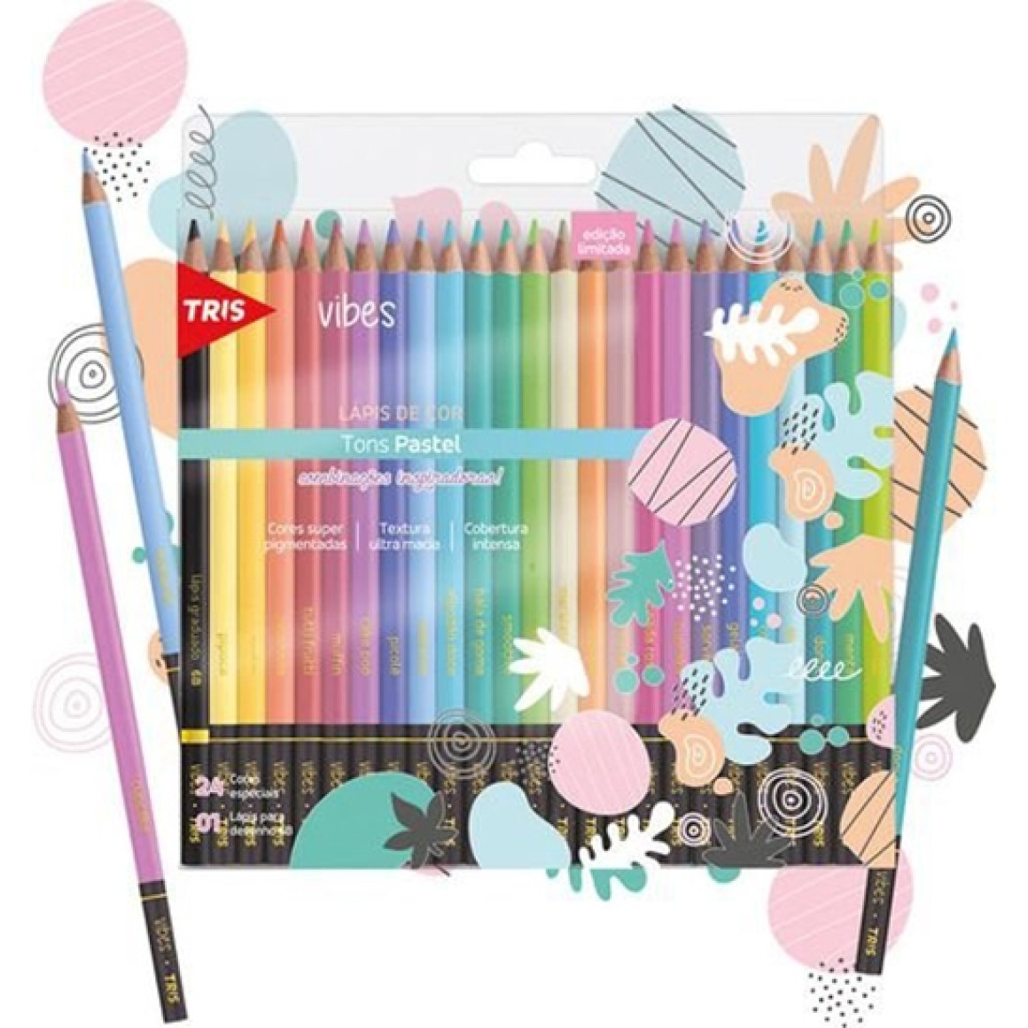 Blister com 24 Lápis de Cor Tons Pastel Vibes Tris, perfeito para pintura. Com combinações inspiradoras, cores super pigmentadas e com textura ultra macia apresenta cobertura intensa. Corpo redondo acompanha 1 lápis grafite 6B.