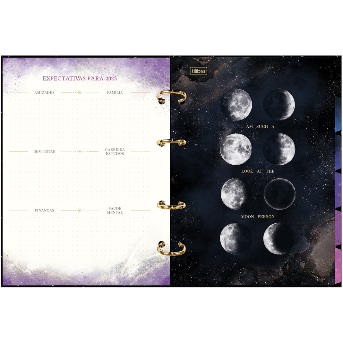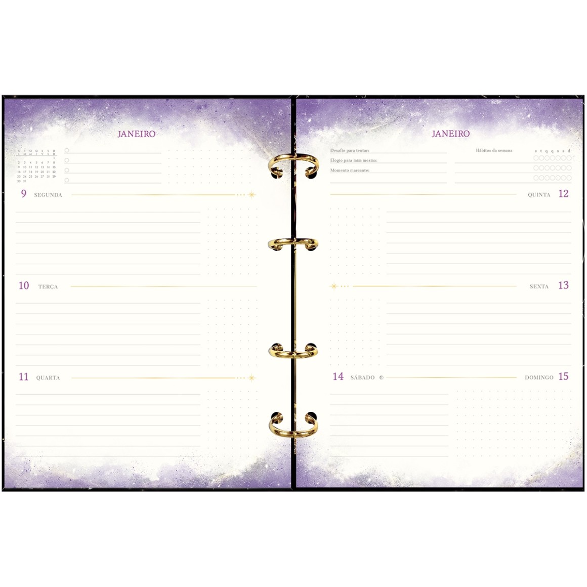 O Planner Argolado 17,7 x 24 cm Magic 90G pode ser usado para organizar os compromissos do dia a dia em casa, no trabalho e na escola. Com formato compacto, leve e bastante funcional, tem capa dura com detalhe metalizado, folha de adesivos, 12 divisórias e bolsa plástica. O miolo deste produto conta com 88 folhas em papel creme, gramatura 90 g/m², com visões anual, mensal e semanal, além de páginas para anotações.