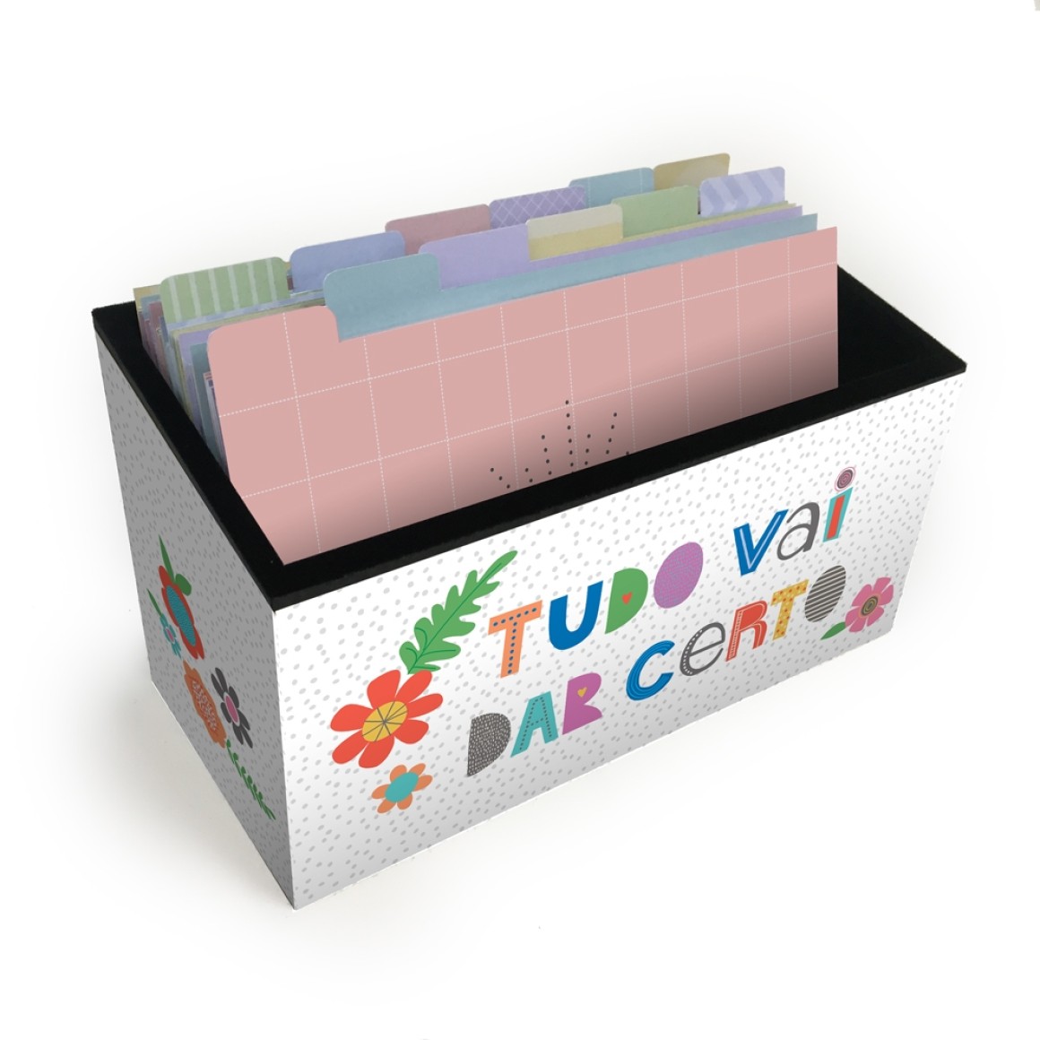Agora você pode organizar suas fichas e guardá-las com muito estilo. Fichário de mesa em MDF revestido e a parte interna tem acabamento em material aveludado. Acompanha um jogo de 12 divisórias coloridas incríveis com frases na frente, papel offset 240g. Você ainda pode personalizar as divisórias como quiser, com nome de matérias, com os meses do ano e com o que mais desejar. Medidas: 22,5 comp. x 9,5 larg. x 13,0 alt.