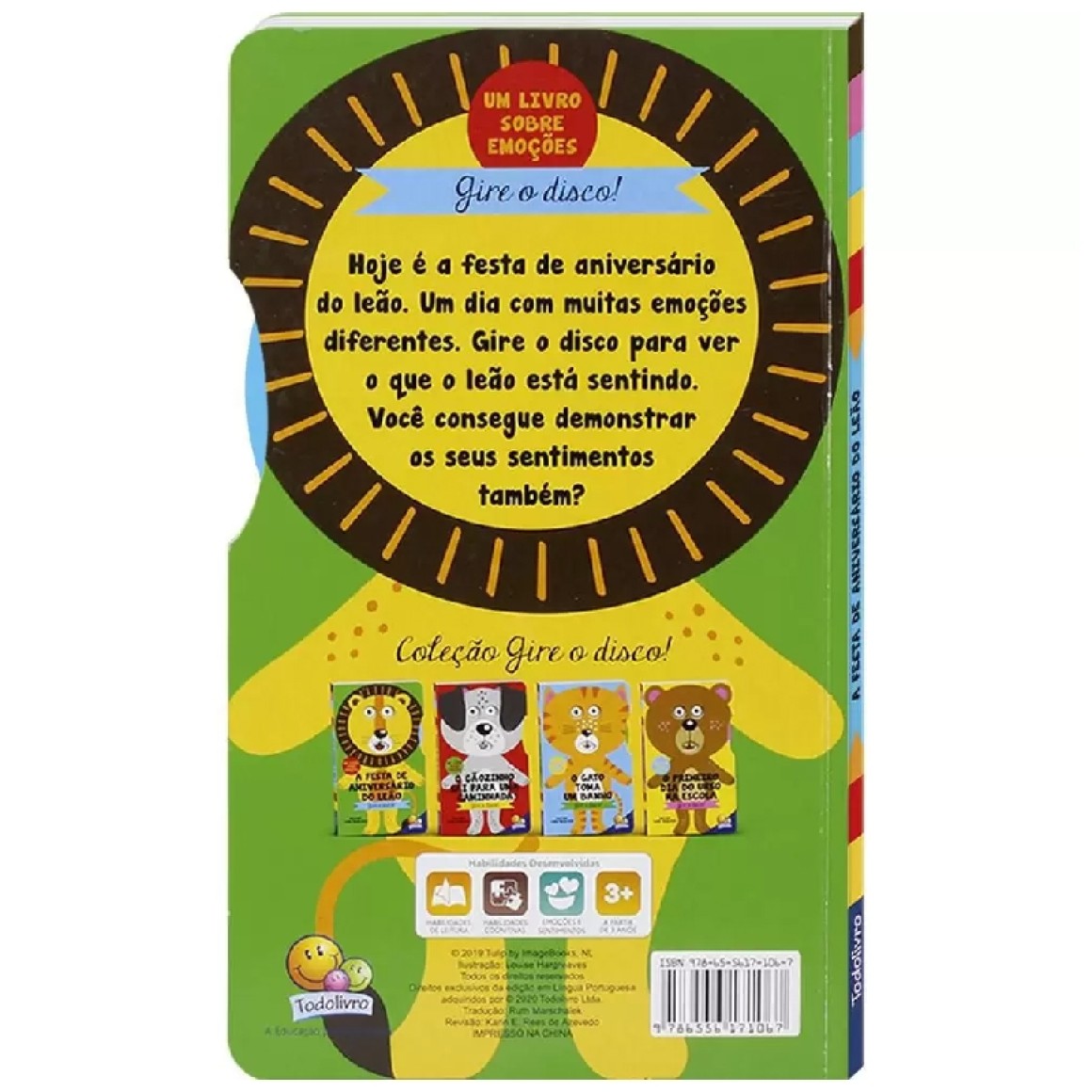 Hoje é a festa de aniversário do leão. Um dia com muitas emoções diferentes. Gire o disco para ver o que o leão está sentindo. Você consegue demonstrar os seus sentimentos também?
