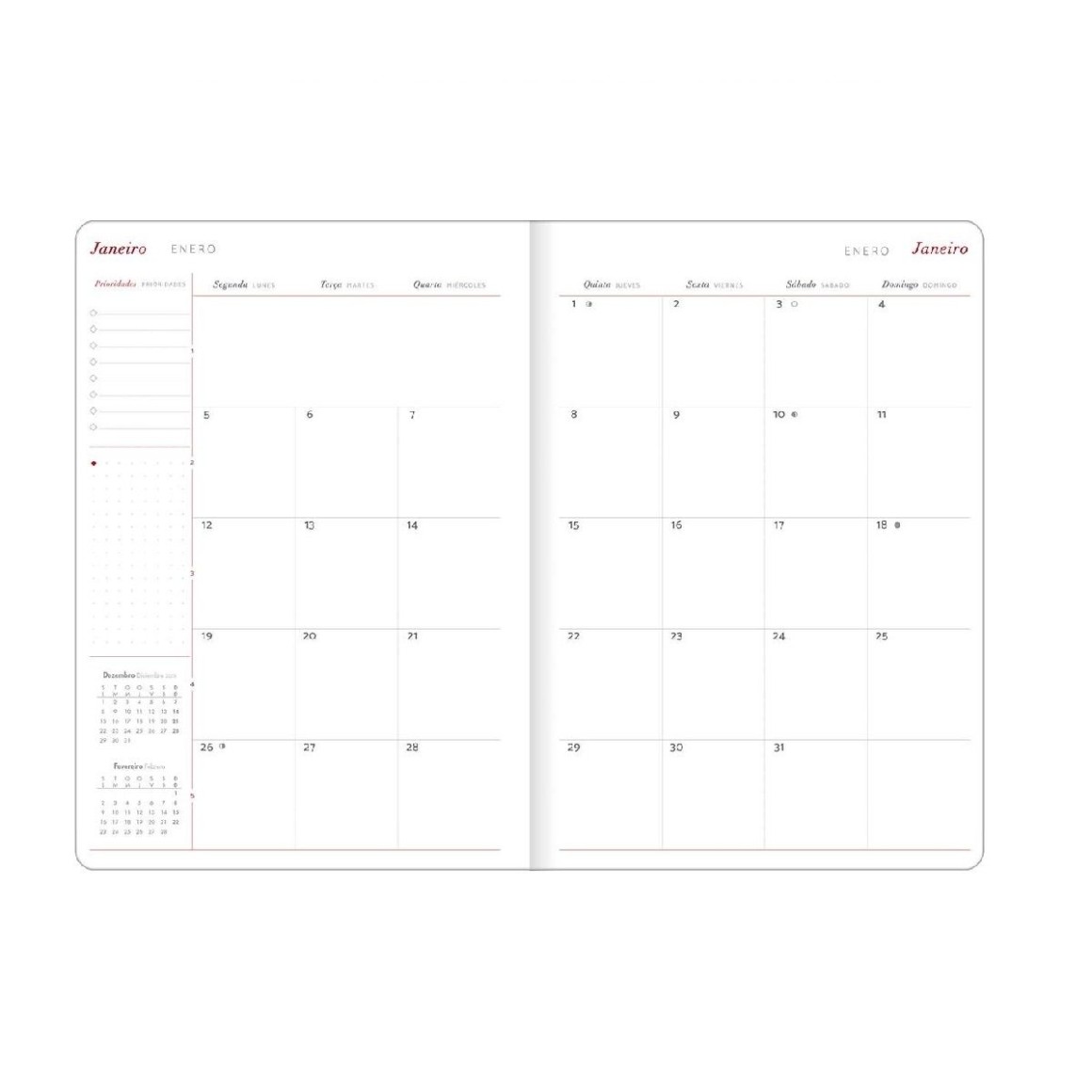 O produto tem capa flexível, visões anual e mensal e miolo com 20 folhas, com gramatura 90 g/m².