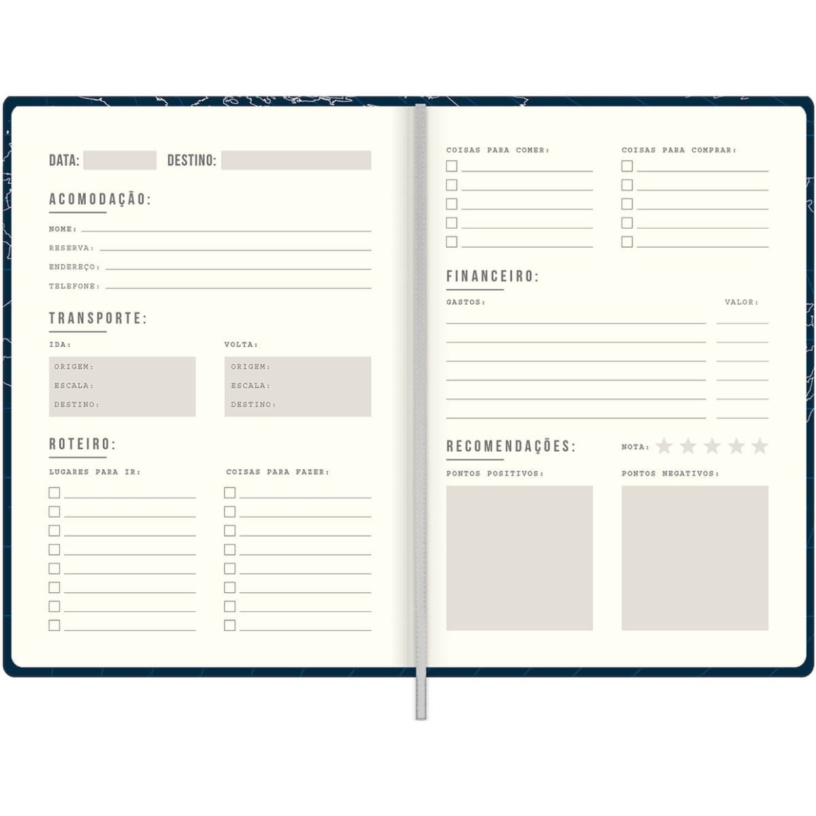 O Diário de Viagem possui capa dura com material especial e parte interna decorada. Possui fitilho e elástico para fechamento. As folhas internas possuem conteúdo e espaço para anotações, e é ideal para registro das aventuras vividas em viagens.