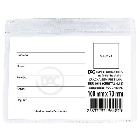 - Ideal para colocar dados cadastrais de funcionários ou participantes de eventos e feiras comerciais e escolares, o crachá DAC com presilha fixa foi projetado em PVC o que proporciona maior tempo de uso e maior durabilidade.